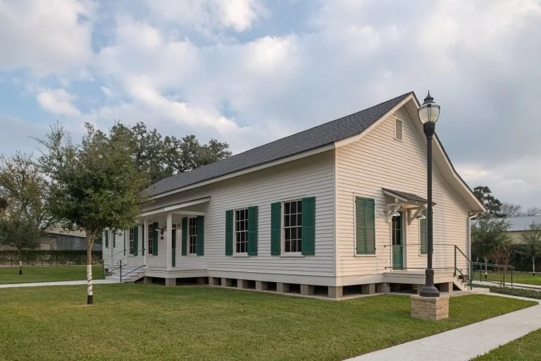 The property on which the English German School is now located was once an unsightly lot that included a dilapidated manufactured home. Significant improvements were undertaken to prepare the property before moving the school. After rehabilitation, nearby century-old live oak trees were cleaned of ball moss, new concrete ADA-compliant walkways and a ramp were constructed, a new lawn was planted, and an irrigation system was installed. Period-appropriate light poles were installed around the property’s perimeter, which matched existing lighting installed on Museum property in previous restoration projects. Raised garden beds were also constructed behind the structure, allowing for educational programming that focuses on food that would have been grown during the late 19th century.