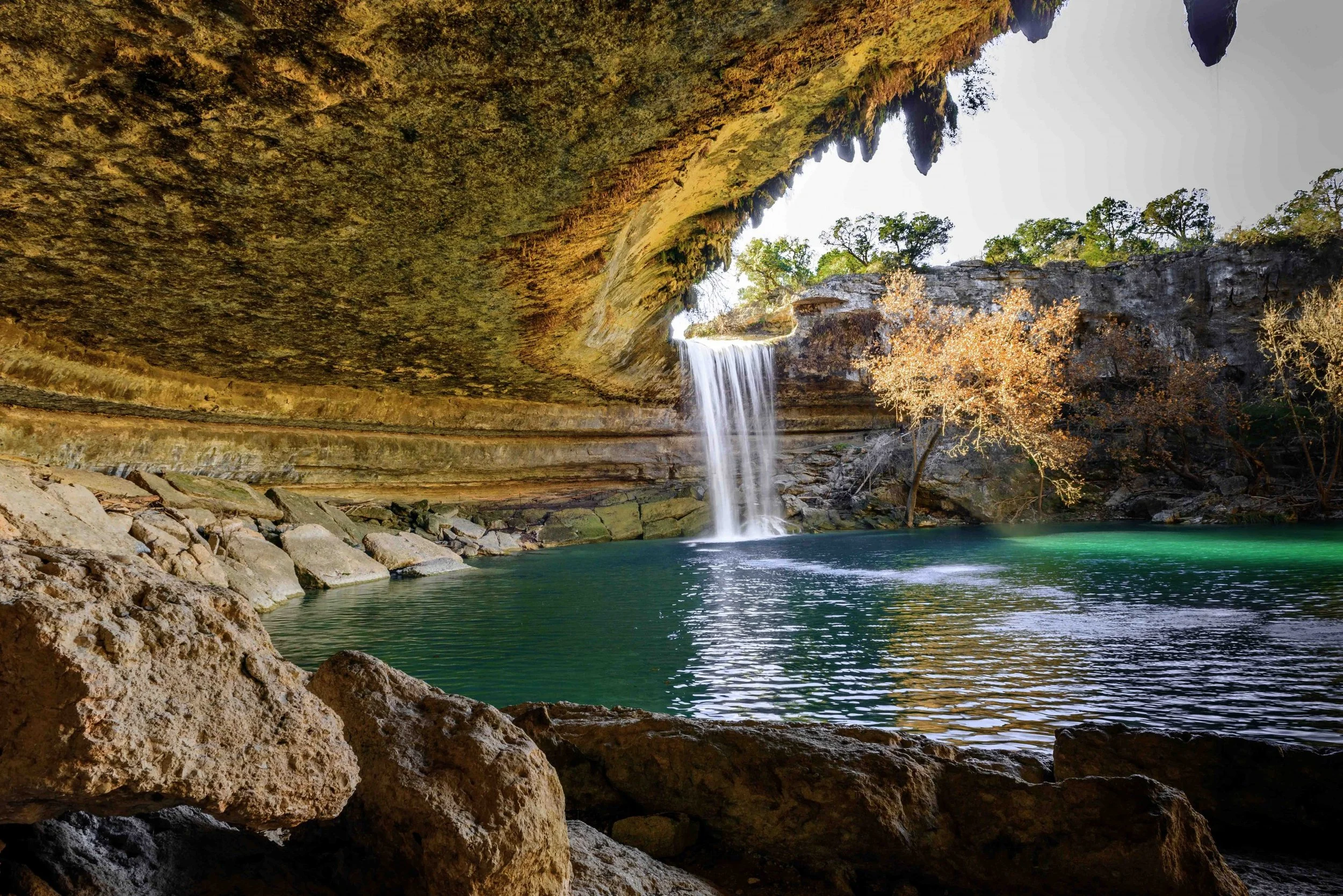 Hamilton Pool Preserve is a natural feature in southwest Travis County upstream from the confluence of Hamilton Creek and the Pedernales River. The pool occurs where Hamilton Creek spills out over limestone outcroppings, creating a 50-foot waterfall that plunges into the head of a steep box canyon. The waterfall never completely dries up though it slows to a trickle in dry times.