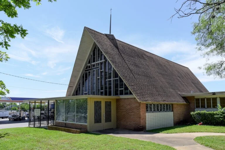 An example of this trend in Austin is Prince of Peace Evangelical Lutheran Church, constructed in 1955-56. It was designed by local architect Eugene Wukasch who was active nationally in the development of modern church architecture in the United States. The building was likely the earliest example of an “A-frame” or “tent-form” church in Central Texas and features unique art glass by Octavio Medellín, the renowned Mexican-American artist. The church has closed and is for sale, and without any local designations, the property could be demolished.